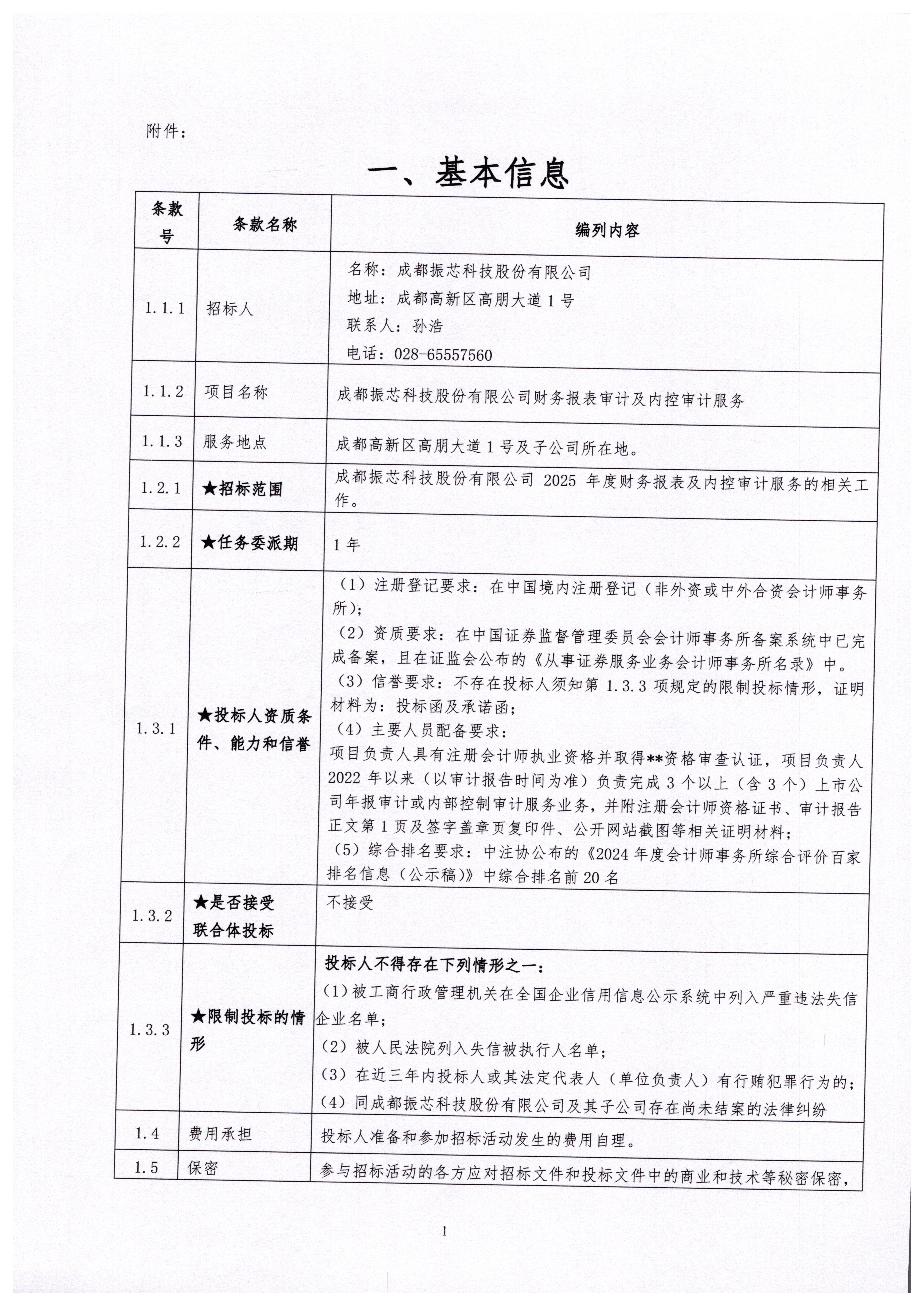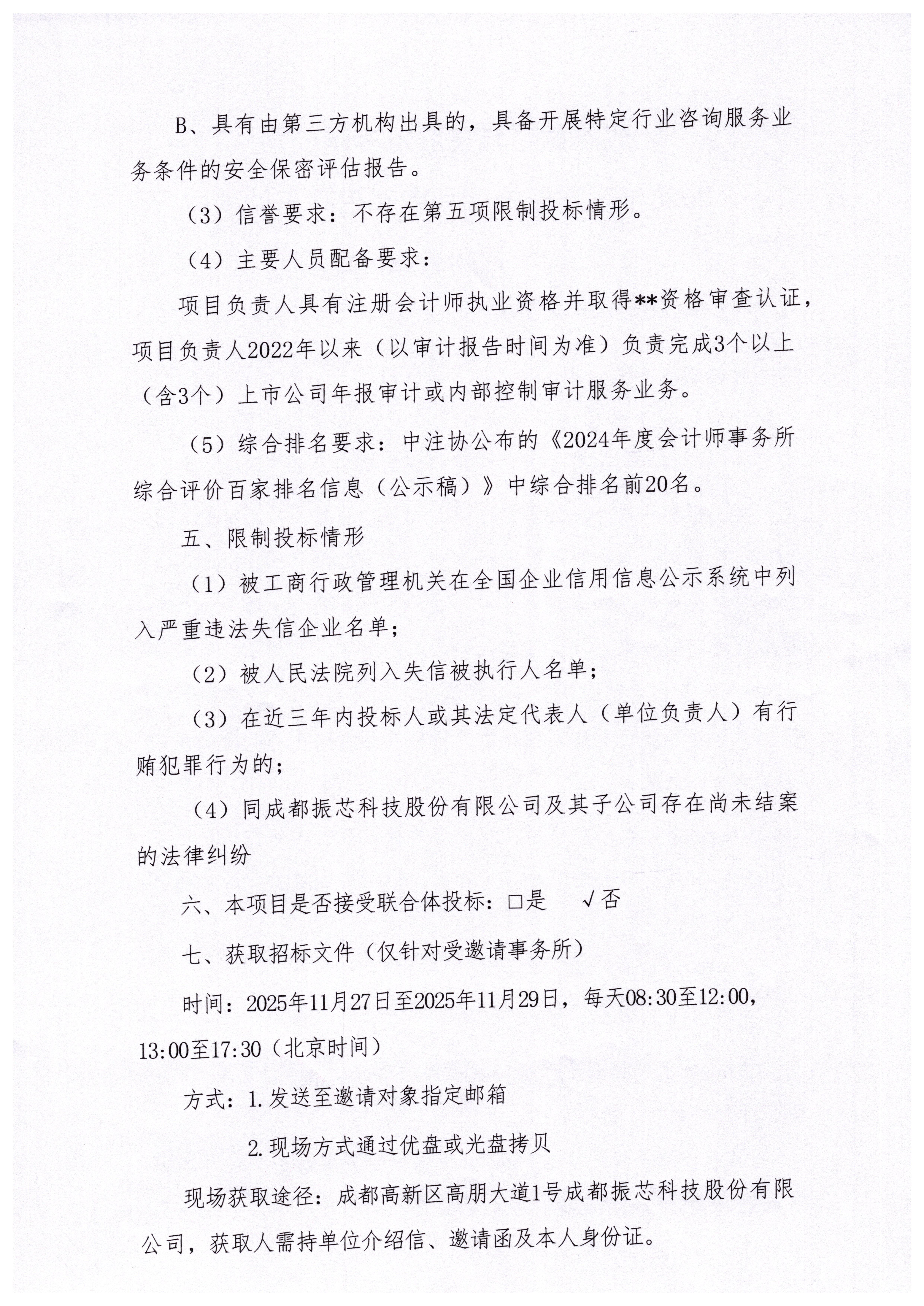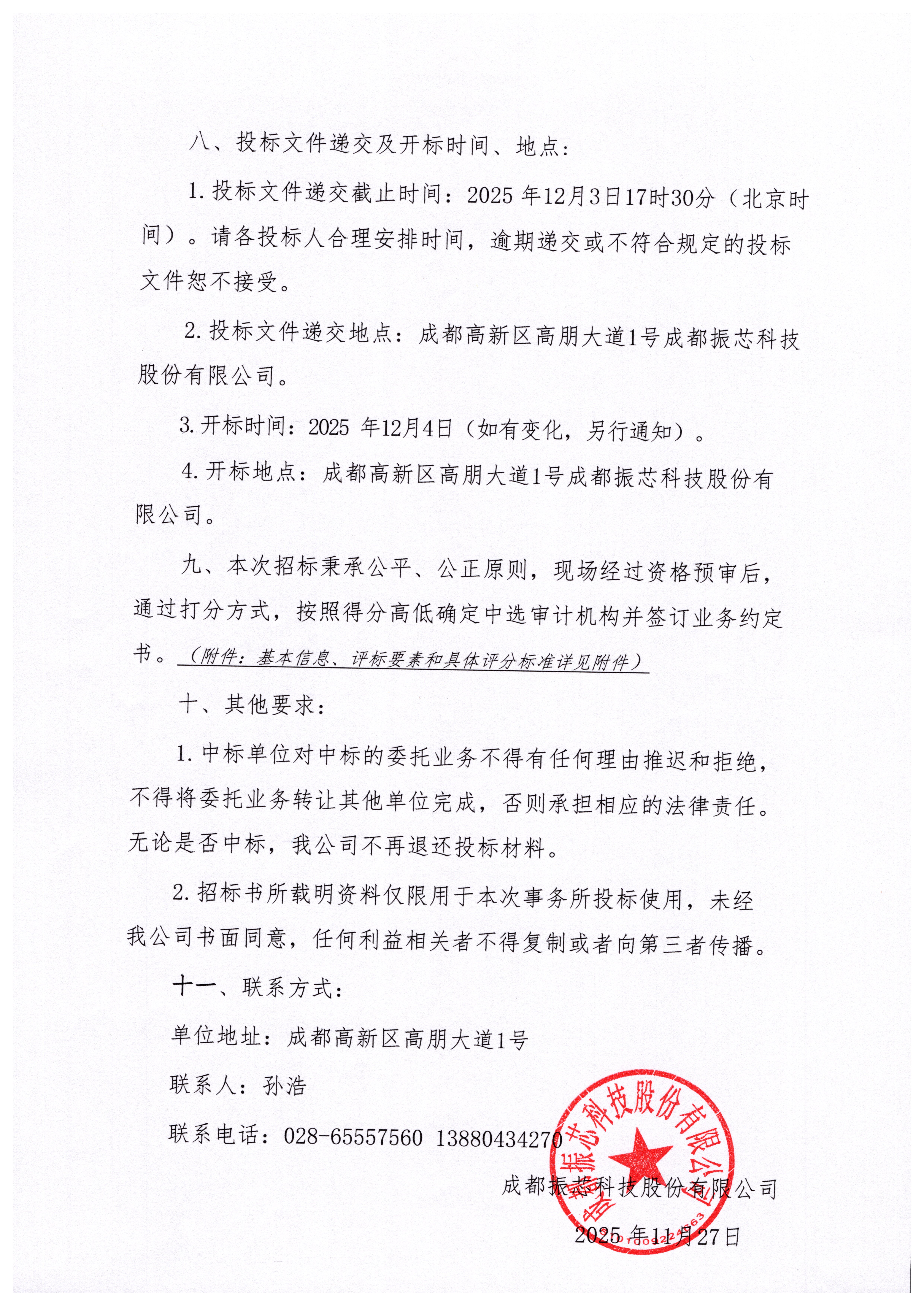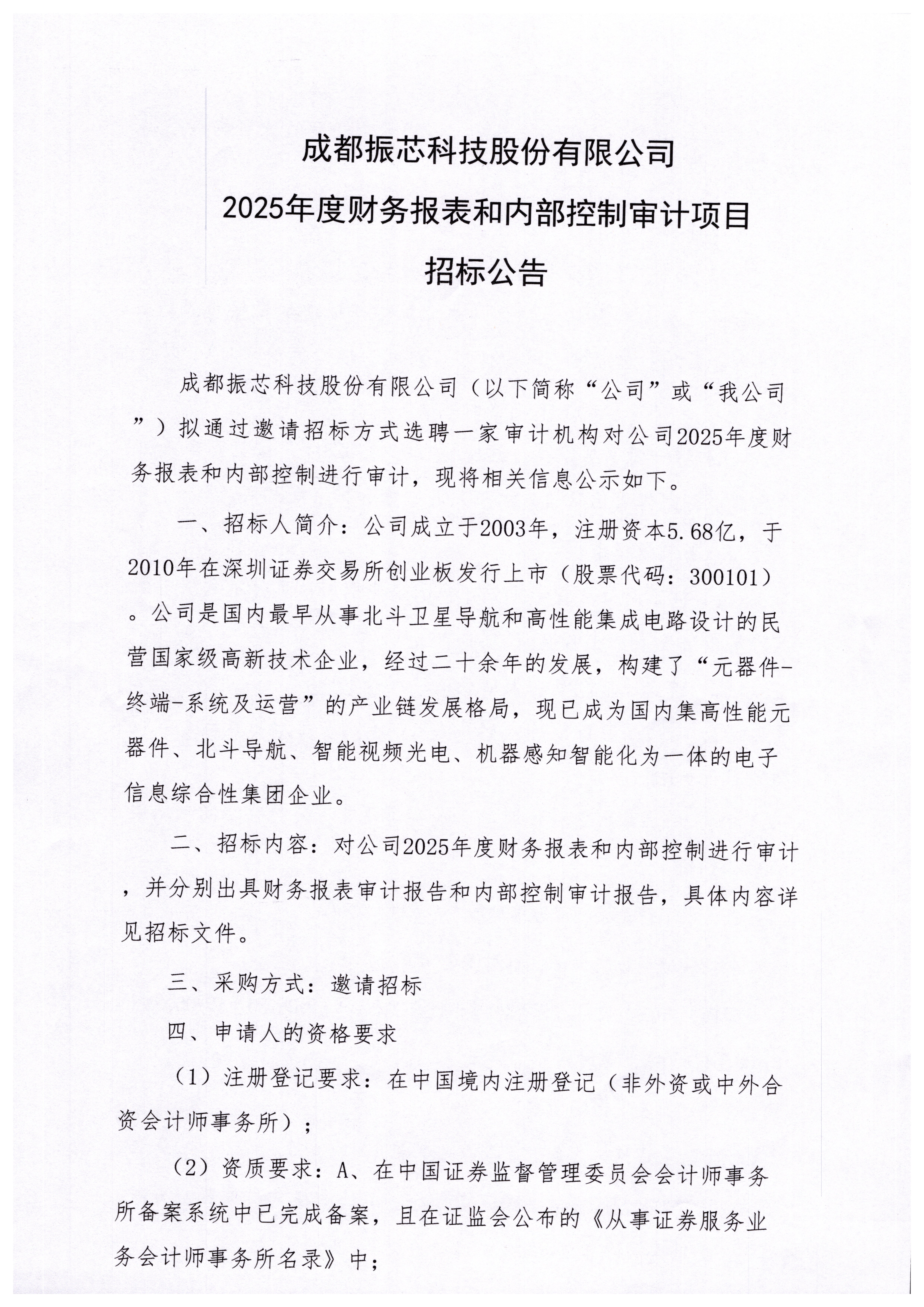 成都振芯科技股份有限公司 2025年度财务报表和内部控制审计项目招标公告